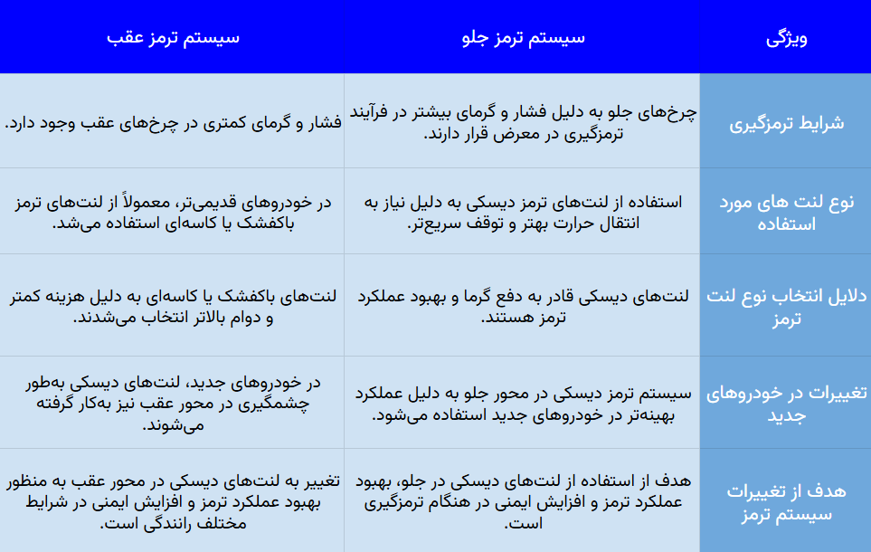 در هر خودرو با توجه به ساختار سیستم ها ترمز، نوع عملکرد سیستم ترمز جلو و عقب با یکدیگر متفاوت است که در ادامه این تفاوت ها را در قالب یک جدول به شما ارائه میدهیم: